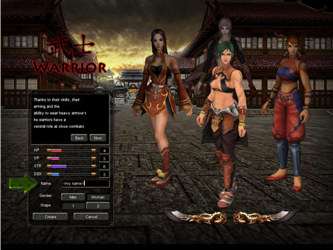 You can use the sword-shaped arrows to choose your character class. When your desired character is shown at the front, you can use the links in the box (marked green) to change the look of the character by choosing between 1 and 2. Subsequently, your character will need a name. After you have chosen a name, click on 'Create' to 'give your character life'. Now you can click on 'Start' to enter the game.